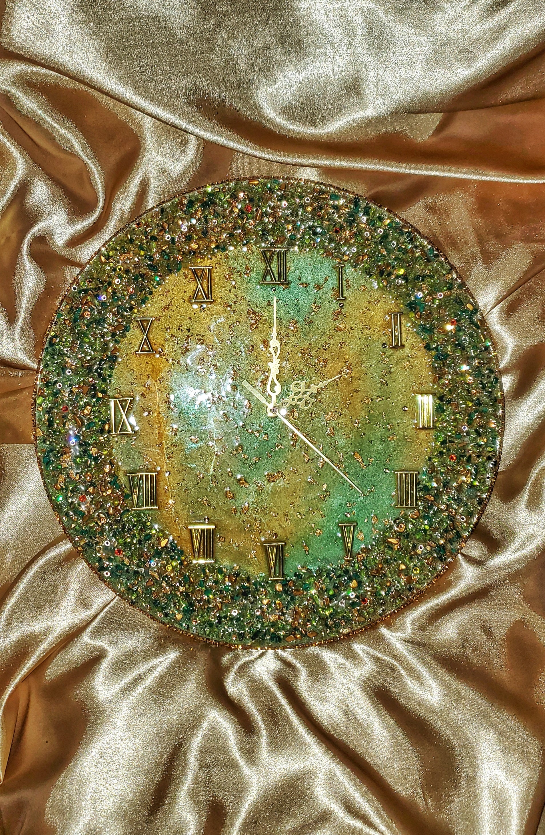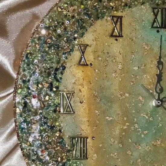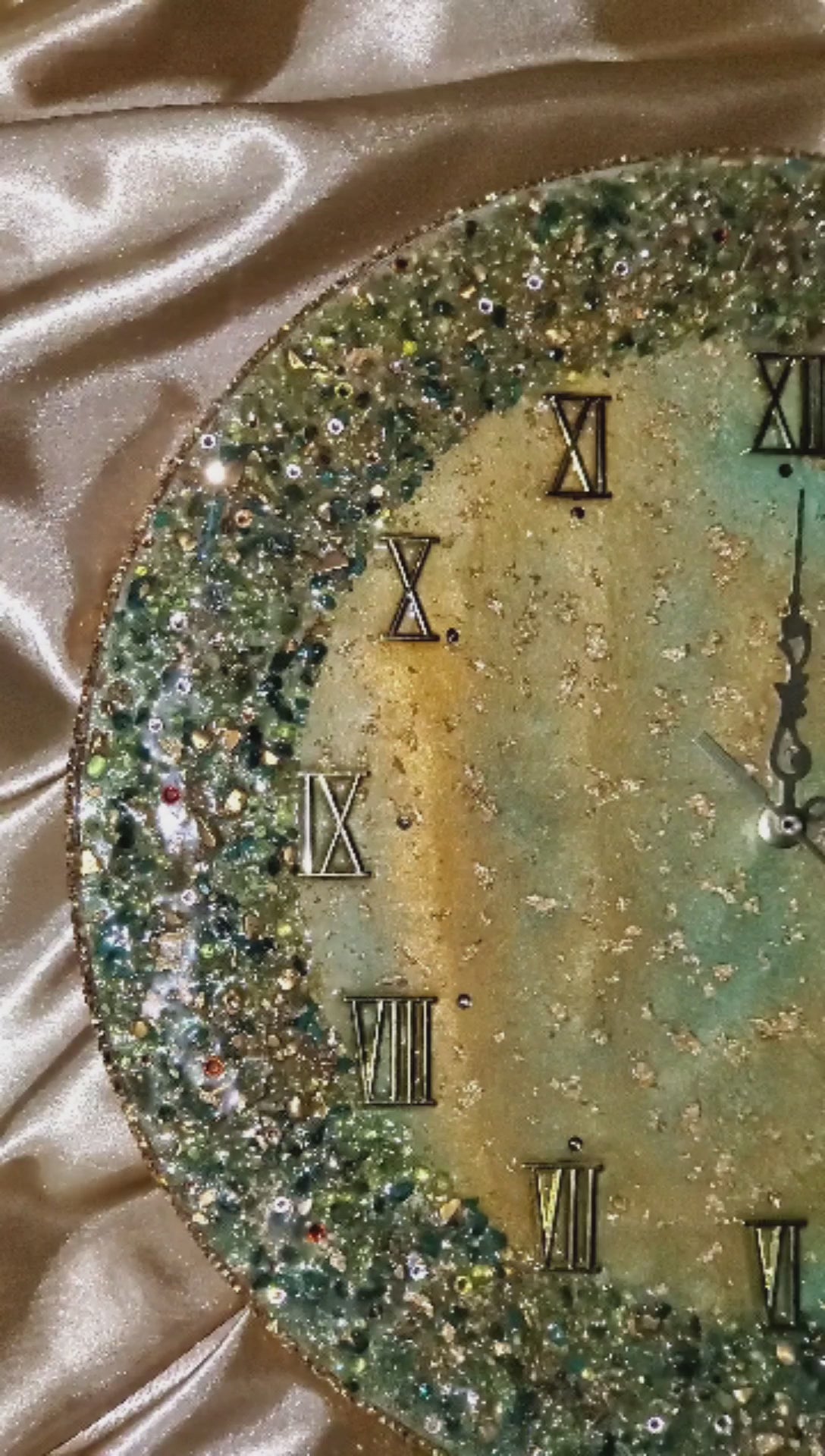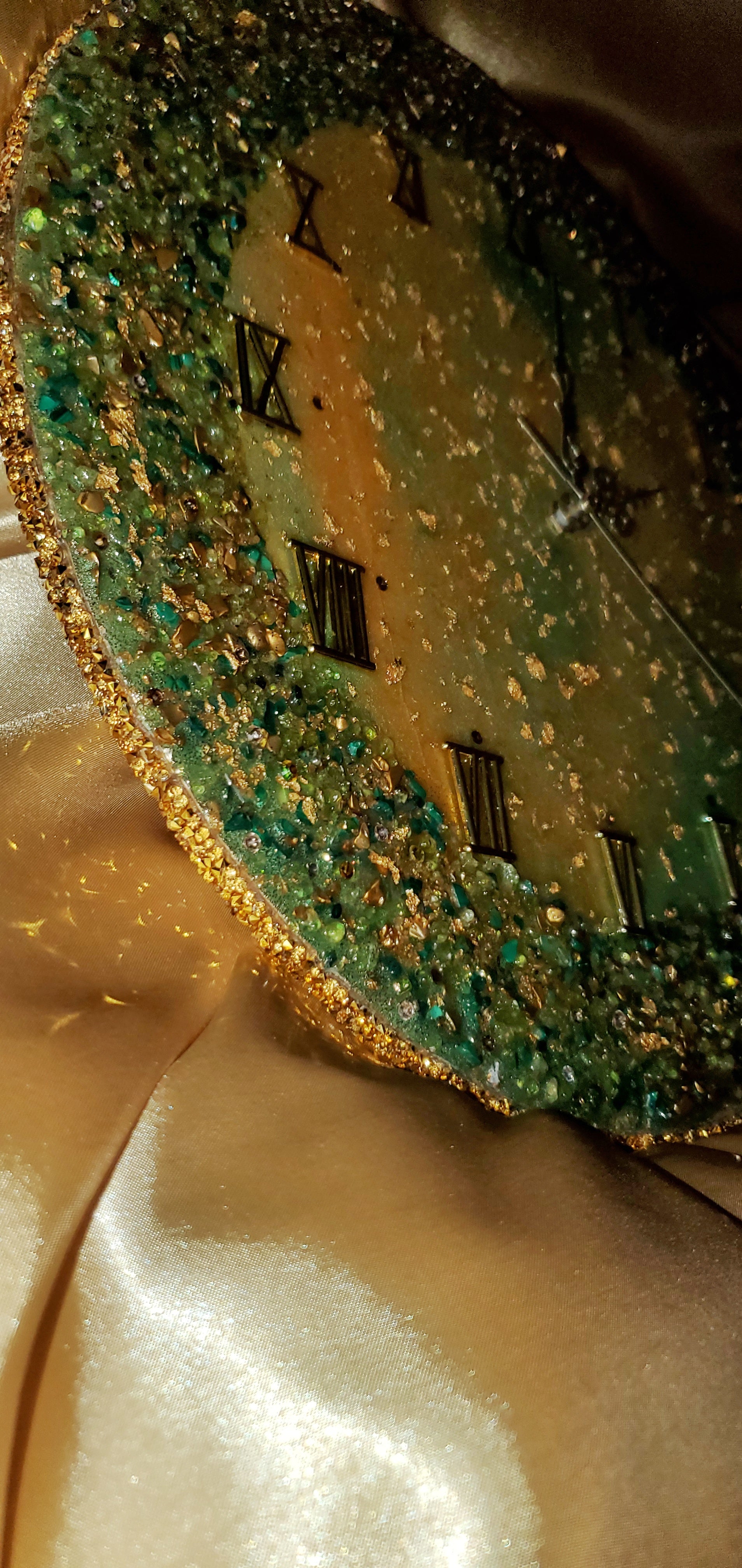 Materials: Art resin, natural olivine stones, natural malachite stones, and other quartz crystals, gold foil leaves, Swarovski elements