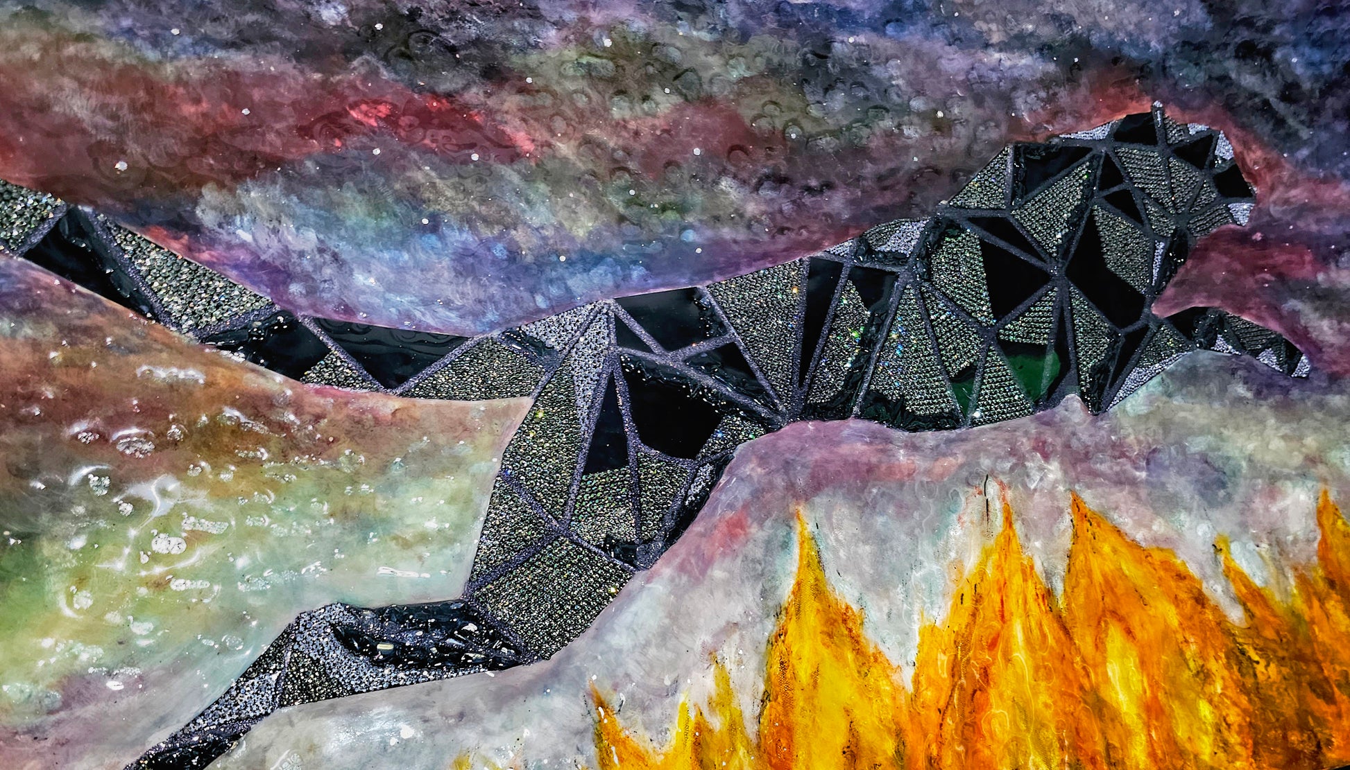 Made with real glass, acrylic mirrors, resin, oil and acrylic paint, and incrustated with sparkling rhinestones.